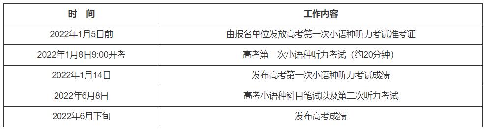 北京市2022年普通高等學(xué)校招生外語(非英語)(以下簡稱“小語種”)聽力考試實行一年兩考。第一次考試于2022年1月8日進行,第二次考試于2022年6月8日進行。具體日程安排如下。