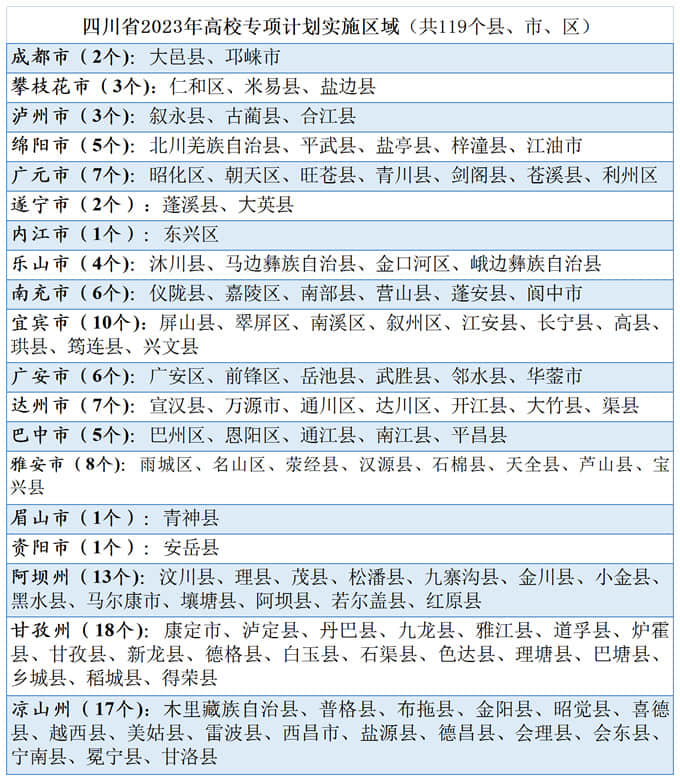 查看更多>>2023-04-19四川省2023年高考國家專項(xiàng)計(jì)劃實(shí)施區(qū)域/包含哪些地方 四川省國家..