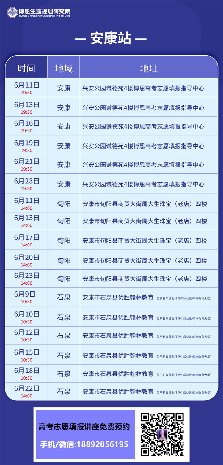 6月11日 19:30 安康 興安公園謙德苑4樓博恩高考志愿填報指導中心