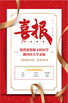 我校姬雨婷,統(tǒng)考209分,全省第7512名,逆襲美術(shù)統(tǒng)考狀元275分,被四川大學(xué)錄取。