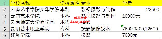 云南省開設(shè)攝影類專業(yè)的院校有哪些?博恩藝考為大家整理了最新云南省開設(shè)攝影類相關(guān)專業(yè)的院校,一共5所,具體信息包含院校名稱,對應(yīng)攝影類專業(yè),學(xué)費(fèi),院校屬性等供大家參考。具體如下所示: