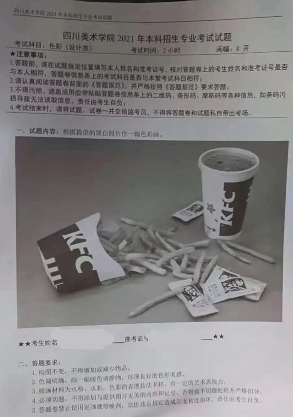 四川美術學院2021年第二場考試于2月26日在蘭州、長沙、鄭州舉行,具體考題如下: