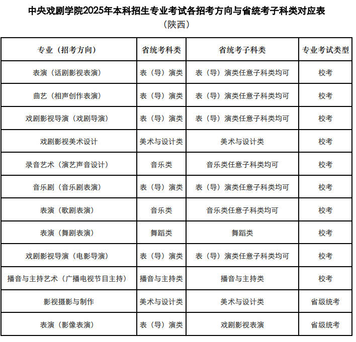 查看更多>>2025-01-17中央戲劇學(xué)院2025年本科招生專業(yè)考試各招考方向與省統(tǒng)考子科類對..