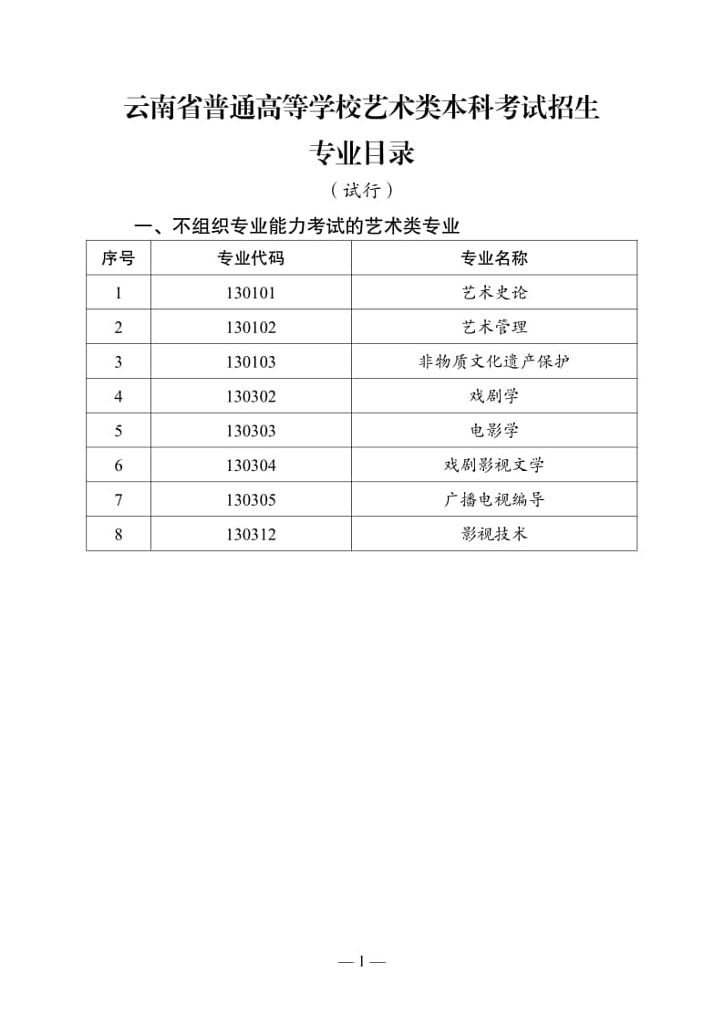 云南省普通高等學校藝術類本科考試招生專業(yè)目錄(試行)注:1.戲曲類專..