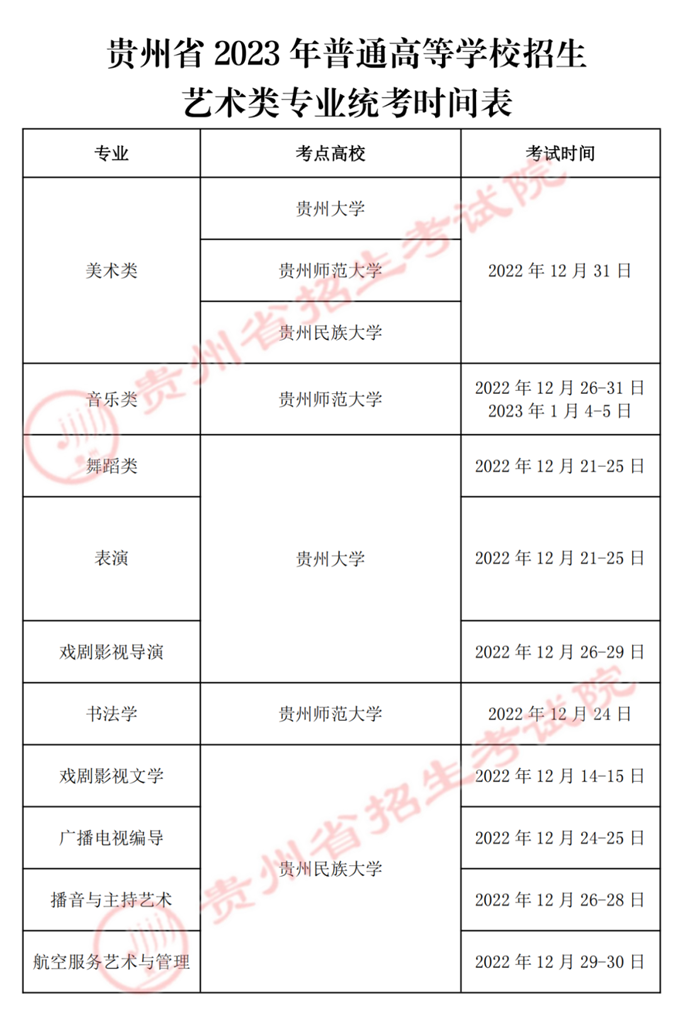 查看更多>>2022-11-11貴州:2023年普通高等學(xué)校招生藝術(shù)類專業(yè)統(tǒng)考時(shí)間表..