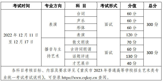 查看更多>>2022-11-01重慶市2023年表演/播音與主持藝術(shù)專業(yè)藝考統(tǒng)考考試流程/地點(diǎn)/時(shí)..