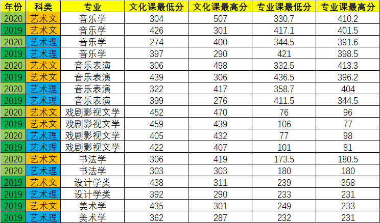 2019/2020年西安文理學院在陜西藝術(shù)類專業(yè)錄取分數(shù)線年份 科..